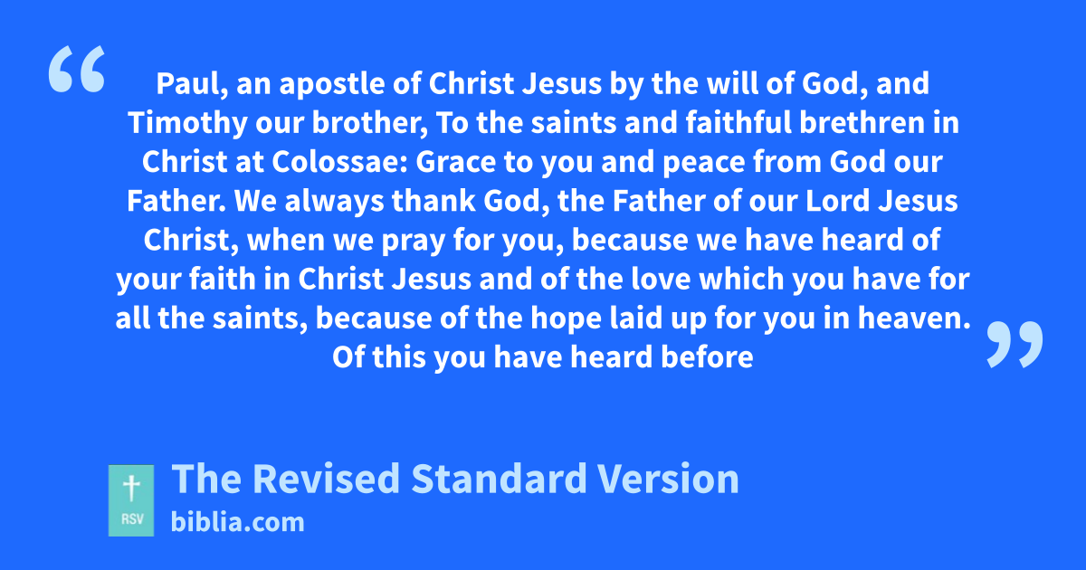 3 We always thank God, the Father of our Lord Jesus Christ, when we pray for you, 4 because we have heard of your faith in Christ Jesus and of the love which you have for all the saints, 5 because of the hope laid up for you in heaven. Of this you have heard before in the word of the truth, the gospel 6 which has come to you, as indeed in the whole world it is bearing fruit and growing—so among yourselves, from the day you heard and understood the grace of God in truth, 7 as you learned it from Epaphras our beloved fellow servant. He is a faithful minister of Christ on our behalf 8 and has made known to us your love in the Spirit.