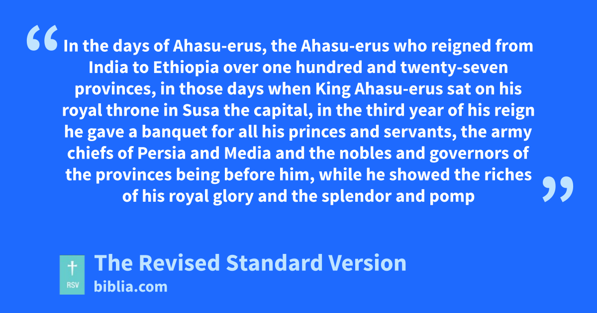 1 In the days of Ahasu-erus, the Ahasu-erus who reigned from India to Ethiopia over one hundred and twenty-seven provinces, 2 in those days when King Ahasu-erus sat on his royal throne in Susa the capital, 3 in the third year of his reign he gave a banquet for all his princes and servants, the army chiefs of Persia and Media and the nobles and governors of the provinces being before him, 4 while he showed the riches of his royal glory and the splendor and pomp of his majesty for many days, a hundred and eighty days. 5 And when these days were completed, the king gave for all the people present in Susa the capital, both great and small, a banquet lasting for seven days, in the court of the garden of the king’s palace. 6 There were white cotton curtains and blue hangings caught up with cords of fine linen and purple to silver rings and marble pillars, and also couches of gold and silver on a mosaic pavement of porphyry, marble, mother-of-pearl and precious stones. 7 Drinks were served in golden goblets, goblets of different kinds, and the royal wine was lavished according to the bounty of the king. 8 And drinking was according to the law, no one was compelled; for the king had given orders to all the officials of his palace to do as every man desired. 9 Queen Vashti also gave a banquet for the women in the palace which belonged to King Ahasu-erus.