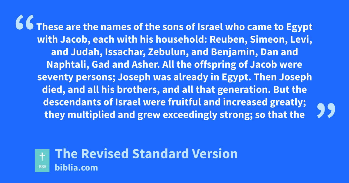 1 These are the names of the sons of Israel who came to Egypt with Jacob, each with his household: 2 Reuben, Simeon, Levi, and Judah, 3 Issachar, Zebulun, and Benjamin, 4 Dan and Naphtali, Gad and Asher. 5 All the offspring of Jacob were seventy persons; Joseph was already in Egypt. 6 Then Joseph died, and all his brothers, and all that generation. 7 But the descendants of Israel were fruitful and increased greatly; they multiplied and grew exceedingly strong; so that the land was filled with them.