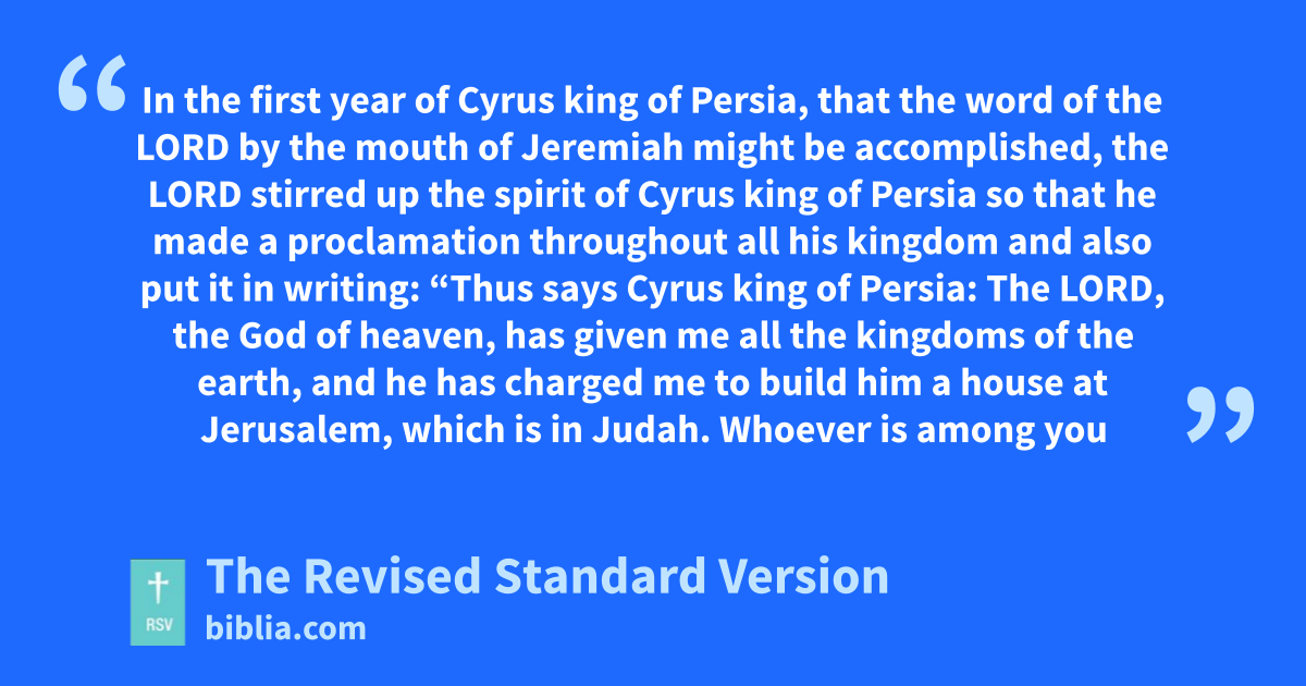 1 In the first year of Cyrus king of Persia, that the word of the Lord by the mouth of Jeremiah might be accomplished, the Lord stirred up the spirit of Cyrus king of Persia so that he made a proclamation throughout all his kingdom and also put it in writing: