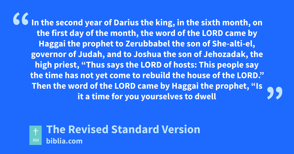1 In the second year of Darius the king, in the sixth month, on the first day of the month, the word of the Lord came by Haggai the prophet to Zerubbabel the son of She-alti-el, governor of Judah, and to Joshua the son of Jehozadak, the high priest, 2 “Thus says the Lord of hosts: This people say the time has not yet come to rebuild the house of the Lord.” 3 Then the word of the Lord came by Haggai the prophet, 4 “Is it a time for you yourselves to dwell in your paneled houses, while this house lies in ruins? 5 Now therefore thus says the Lord of hosts: Consider how you have fared. 6 You have sown much, and harvested little; you eat, but you never have enough; you drink, but you never have your fill; you clothe yourselves, but no one is warm; and he who earns wages earns wages to put them into a bag with holes.