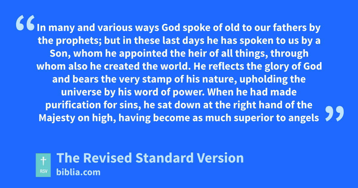 1 In many and various ways God spoke of old to our fathers by the prophets; 2 but in these last days he has spoken to us by a Son, whom he appointed the heir of all things, through whom also he created the world. 3 He reflects the glory of God and bears the very stamp of his nature, upholding the universe by his word of power. When he had made purification for sins, he sat down at the right hand of the Majesty on high, 4 having become as much superior to angels as the name he has obtained is more excellent than theirs.
