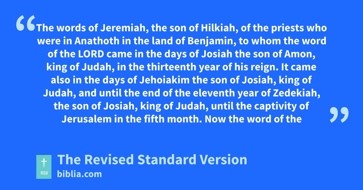 1 The words of Jeremiah, the son of Hilkiah, of the priests who were in Anathoth in the land of Benjamin, 2 to whom the word of the Lord came in the days of Josiah the son of Amon, king of Judah, in the thirteenth year of his reign. 3 It came also in the days of Jehoiakim the son of Josiah, king of Judah, and until the end of the eleventh year of Zedekiah, the son of Josiah, king of Judah, until the captivity of Jerusalem in the fifth month.