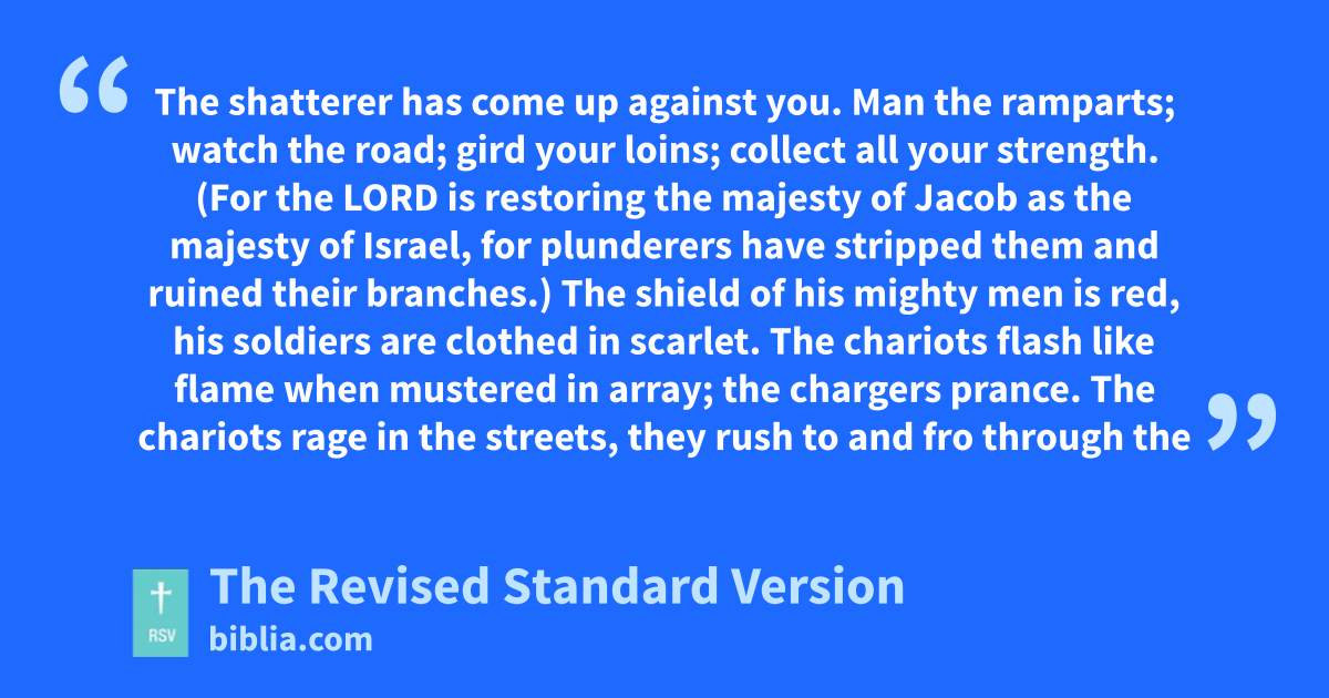 13 Behold, I am against you, says the Lord of hosts, and I will burn your chariots in smoke, and the sword shall devour your young lions; I will cut off your prey from the earth, and the voice of your messengers shall no more be heard.
