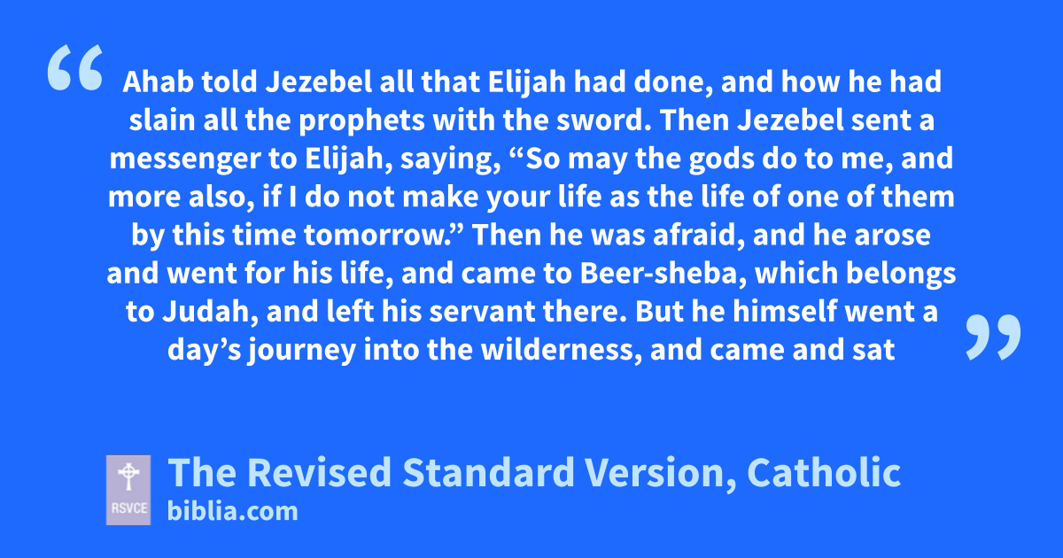 1 Ahab told Jezebel all that Elijah had done, and how he had slain all the prophets with the sword. 2 Then Jezebel sent a messenger to Elijah, saying, “So may the gods do to me, and more also, if I do not make your life as the life of one of them by this time tomorrow.” 3 Then he was afraid, and he arose and went for his life, and came to Beer-sheba, which belongs to Judah, and left his servant there.