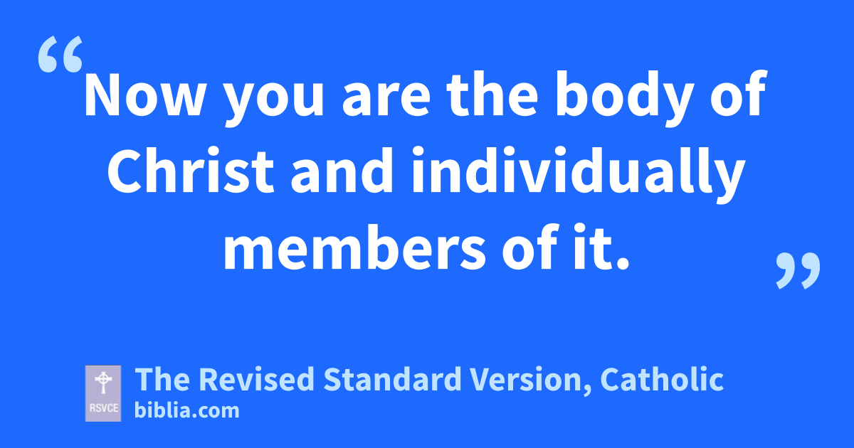 14 For the body does not consist of one member but of many. 15 If the foot should say, “Because I am not a hand, I do not belong to the body,” that would not make it any less a part of the body. 16 And if the ear should say, “Because I am not an eye, I do not belong to the body,” that would not make it any less a part of the body. 17 If the whole body were an eye, where would be the hearing? If the whole body were an ear, where would be the sense of smell? 18 But as it is, God arranged the organs in the body, each one of them, as he chose. 19 If all were a single organ, where would the body be? 20 As it is, there are many parts, yet one body. 21 The eye cannot say to the hand, “I have no need of you,” nor again the head to the feet, “I have no need of you.” 22 On the contrary, the parts of the body which seem to be weaker are indispensable, 23 and those parts of the body which we think less honorable we invest with the greater honor, and our unpresentable parts are treated with greater modesty, 24 which our more presentable parts do not require. But God has so composed the body, giving the greater honor to the inferior part, 25 that there may be no discord in the body, but that the members may have the same care for one another. 26 If one member suffers, all suffer together; if one member is honored, all rejoice together.