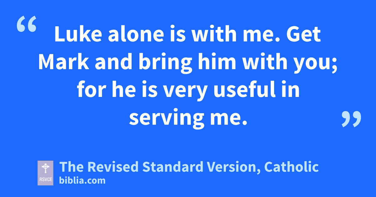 9 Do your best to come to me soon. 10 For Demas, in love with this present world, has deserted me and gone to Thessalonica; Crescens has gone to Galatia,* Titus to Dalmatia. 11 Luke alone is with me. Get Mark and bring him with you; for he is very useful in serving me. 12 Tychicus I have sent to Ephesus. 13 When you come, bring the cloak that I left with Carpus at Troas, also the books, and above all the parchments. 14 Alexander the coppersmith did me great harm; the Lord will requite him for his deeds. 15 Beware of him yourself, for he strongly opposed our message. 16 At my first defense no one took my part; all deserted me. May it not be charged against them! 17 But the Lord stood by me and gave me strength to proclaim the message fully, that all the Gentiles might hear it. So I was rescued from the lion’s mouth. 18 The Lord will rescue me from every evil and save me for his heavenly kingdom. To him be the glory for ever and ever. Amen.