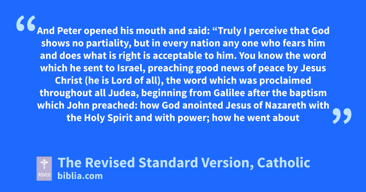 34 And Peter opened his mouth and said: “Truly I perceive that God shows no partiality, 35 but in every nation any one who fears him and does what is right is acceptable to him. 36 You know the word which he sent to Israel, preaching good news of peace by Jesus Christ (he is Lord of all), 37 the word which was proclaimed throughout all Judea, beginning from Galilee after the baptism which John preached: 38 how God anointed Jesus of Nazareth with the Holy Spirit and with power; how he went about doing good and healing all that were oppressed by the devil, for God was with him. 39 And we are witnesses to all that he did both in the country of the Jews and in Jerusalem. They put him to death by hanging him on a tree; 40 but God raised him on the third day and made him manifest; 41 not to all the people but to us who were chosen by God as witnesses, who ate and drank with him after he rose from the dead. 42 And he commanded us to preach to the people, and to testify that he is the one ordained by God to be judge of the living and the dead. 43 To him all the prophets bear witness that every one who believes in him receives forgiveness of sins through his name.”