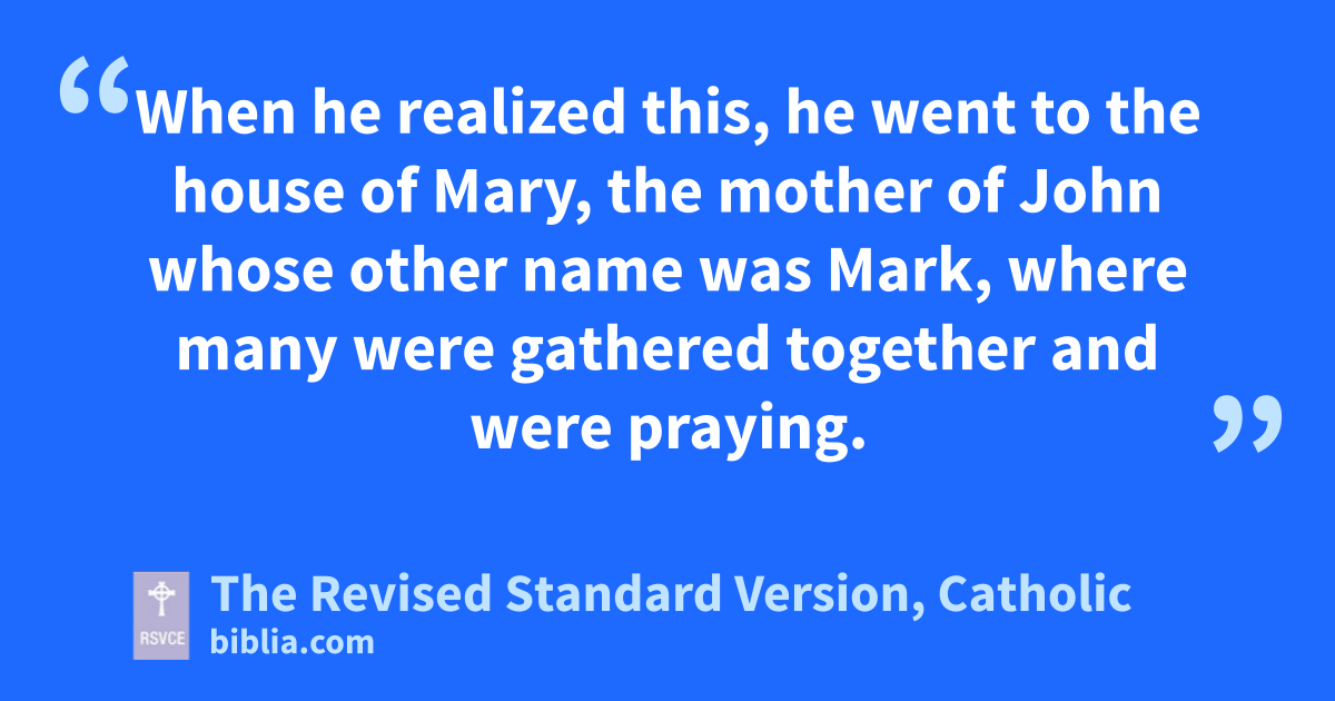 12 When he realized this, he went to the house of Mary, the mother of John whose other name was Mark, where many were gathered together and were praying. 13 And when he knocked at the door of the gateway, a maid named Rhoda came to answer. 14 Recognizing Peter’s voice, in her joy she did not open the gate but ran in and told that Peter was standing at the gate. 15 They said to her, “You are mad.” But she insisted that it was so. They said, “It is his angel!” 16 But Peter continued knocking; and when they opened, they saw him and were amazed. 17 But motioning to them with his hand to be silent, he described to them how the Lord had brought him out of the prison. And he said, “Tell this to James and to the brethren.” Then he departed and went to another place.