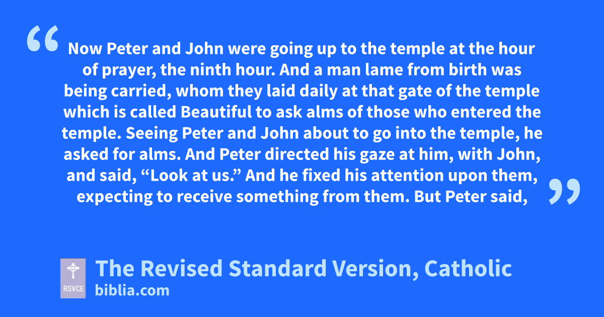 1 Now Peter and John were going up to the temple at the hour of prayer, the ninth hour. 2 And a man lame from birth was being carried, whom they laid daily at that gate of the temple which is called Beautiful to ask alms of those who entered the temple. 3 Seeing Peter and John about to go into the temple, he asked for alms. 4 And Peter directed his gaze at him, with John, and said, “Look at us.” 5 And he fixed his attention upon them, expecting to receive something from them. 6 But Peter said, “I have no silver and gold, but I give you what I have; in the name of Jesus Christ of Nazareth, walk.” 7 And he took him by the right hand and raised him up; and immediately his feet and ankles were made strong. 8 And leaping up he stood and walked and entered the temple with them, walking and leaping and praising God. 9 And all the people saw him walking and praising God, 10 and recognized him as the one who sat for alms at the Beautiful Gate of the temple; and they were filled with wonder and amazement at what had happened to him.