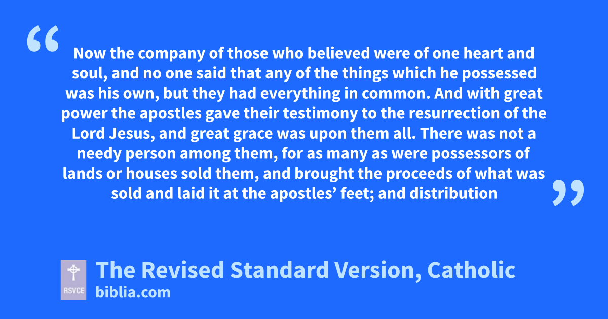 32 Now the company of those who believed were of one heart and soul, and no one said that any of the things which he possessed was his own, but they had everything in common. 33 And with great power the apostles gave their testimony to the resurrection of the Lord Jesus, and great grace was upon them all. 34 There was not a needy person among them, for as many as were possessors of lands or houses sold them, and brought the proceeds of what was sold 35 and laid it at the apostles’ feet; and distribution was made to each as any had need. 36 Thus Joseph who was surnamed by the apostles Barnabas (which means, Son of encouragement), a Levite, a native of Cyprus, 37 sold a field which belonged to him, and brought the money and laid it at the apostles’ feet.