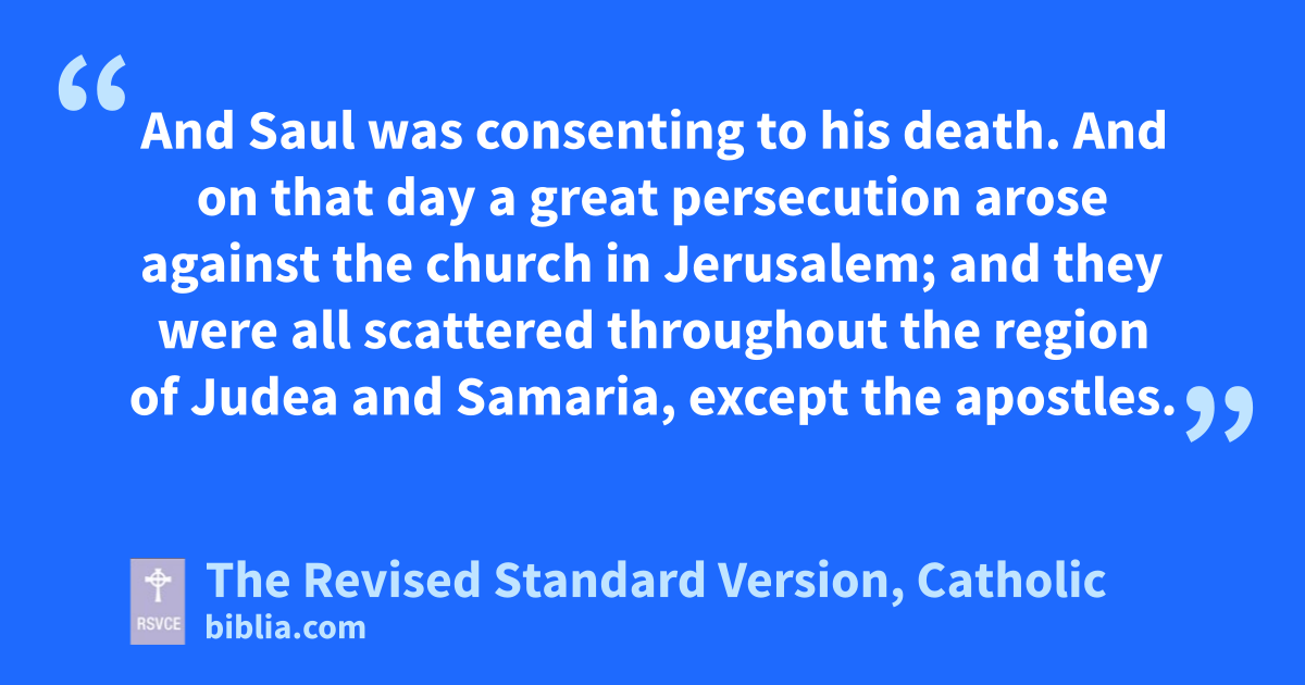 And on that day a great persecution arose against the church in Jerusalem; and they were all scattered throughout the region of Judea and Samaria, except the apostles. 2 Devout men buried Stephen, and made great lamentation over him. 3 But Saul was ravaging the church, and entering house after house, he dragged off men and women and committed them to prison.