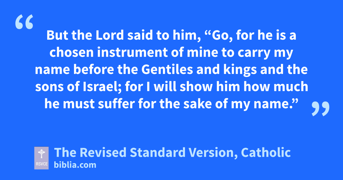 10 Now there was a disciple at Damascus named Ananias. The Lord said to him in a vision, “Ananias.” And he said, “Here I am, Lord.” 11 And the Lord said to him, “Rise and go to the street called Straight, and inquire in the house of Judas for a man of Tarsus named Saul; for behold, he is praying, 12 and he has seen a man named Ananias come in and lay his hands on him so that he might regain his sight.” 13 But Ananias answered, “Lord, I have heard from many about this man, how much evil he has done to thy saints at Jerusalem; 14 and here he has authority from the chief priests to bind all who call upon thy name.” 15 But the Lord said to him, “Go, for he is a chosen instrument of mine to carry my name before the Gentiles and kings and the sons of Israel; 16 for I will show him how much he must suffer for the sake of my name.” 17 So Ananias departed and entered the house. And laying his hands on him he said, “Brother Saul, the Lord Jesus who appeared to you on the road by which you came, has sent me that you may regain your sight and be filled with the Holy Spirit.” 18 And immediately something like scales fell from his eyes and he regained his sight. Then he rose and was baptized, 19 and took food and was strengthened.