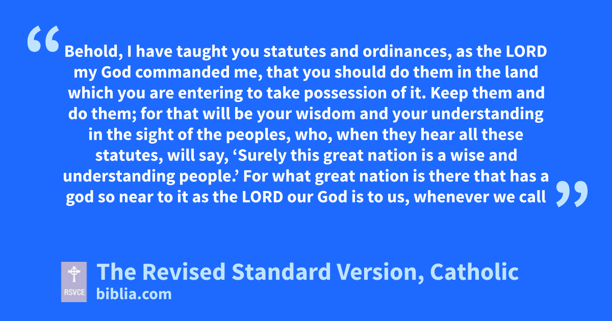 1 “And now, O Israel, give heed to the statutes and the ordinances which I teach you, and do them; that you may live, and go in and take possession of the land which the Lord, the God of your fathers, gives you. 2 You shall not add to the word which I command you, nor take from it; that you may keep the commandments of the Lord your God which I command you. 3 Your eyes have seen what the Lord did at Baal-peor; for the Lord your God destroyed from among you all the men who followed the Baal of Peor; 4 but you who held fast to the Lord your God are all alive this day. 5 Behold, I have taught you statutes and ordinances, as the Lord my God commanded me, that you should do them in the land which you are entering to take possession of it. 6 Keep them and do them; for that will be your wisdom and your understanding in the sight of the peoples, who, when they hear all these statutes, will say, ‘Surely this great nation is a wise and understanding people.’ 7 For what great nation is there that has a god so near to it as the Lord our God is to us, whenever we call upon him? 8 And what great nation is there, that has statutes and ordinances so righteous as all this law which I set before you this day?