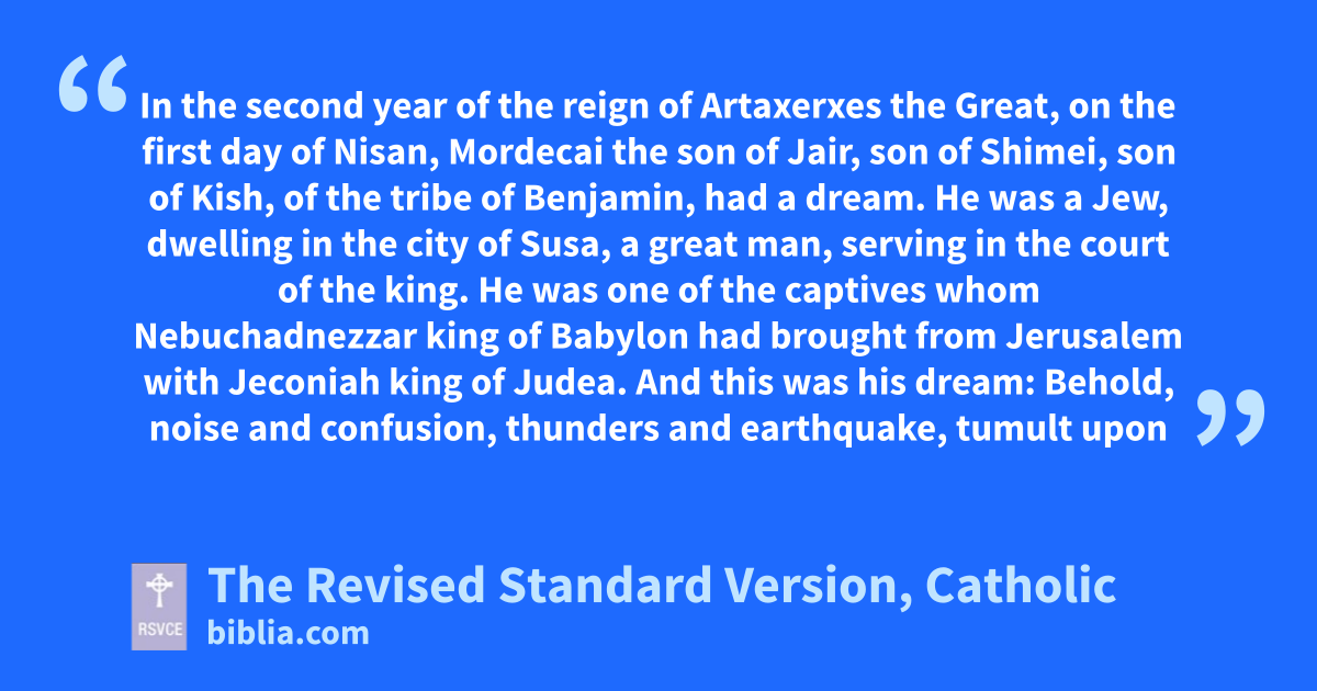 2 In the second year of the reign of Artaxerxes the Great, on the first day of Nisan, Mordecai the son of Jair, son of Shimei, son of Kish, of the tribe of Benjamin, had a dream. 3 He was a Jew, dwelling in the city of Susa, a great man, serving in the court of the king. 4 He was one of the captives whom Nebuchadnezzar king of Babylon had brought from Jerusalem with Jeconiah king of Judea. And this was his dream: 5 Behold, noisea and confusion, thunders and earthquake, tumult upon the earth! 6 And behold, two great dragons came forward, both ready to fight, and they roared terribly. 7 And at their roaring every nation prepared for war, to fight against the nation of the righteous. 8 And behold, a day of darkness and gloom, tribulation and distress, affliction and great tumult upon the earth! 9 And the whole righteous nation was troubled; they feared the evils that threatened them, and were ready to perish. 10 Then they cried to God; and from their cry, as though from a tiny spring, there came a great river, with abundant water; 11 light came, and the sun rose, and the lowly were exalted and consumed those held in honor.
