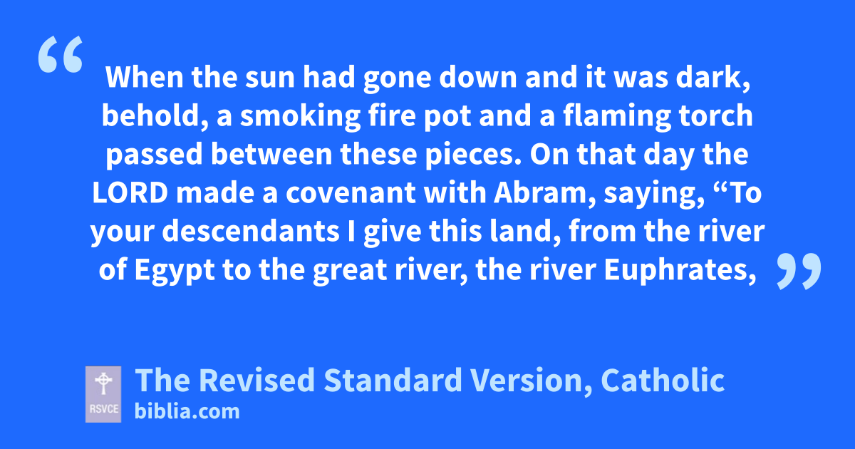 17 When the sun had gone down and it was dark, behold, a smoking fire pot and a flaming torch passed between these pieces. 18 On that day the Lord made a covenant with Abram, saying, “To your descendants I give this land, from the river of Egypt to the great river, the river Euphrates, 19 the land of the Kenites, the Kenizzites, the Kadmonites, 20 the Hittites, the Perizzites, the Rephaim, 21 the Amorites, the Canaanites, the Girgashites and the Jebusites.”