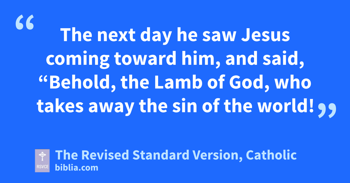 29 The next day he saw Jesus coming toward him, and said, “Behold, the Lamb of God, who takes away the sin of the world! 30 This is he of whom I said, ‘After me comes a man who ranks before me, for he was before me.’ 31 I myself did not know him; but for this I came baptizing with water, that he might be revealed to Israel.” 32 And John bore witness, “I saw the Spirit descend as a dove from heaven, and it remained on him. 33 I myself did not know him; but he who sent me to baptize with water said to me, ‘He on whom you see the Spirit descend and remain, this is he who baptizes with the Holy Spirit.’ 34 And I have seen and have borne witness that this is the Son of God.”