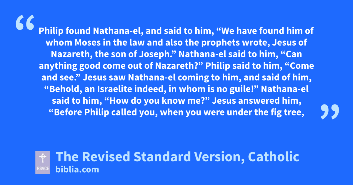 43 The next day Jesus decided to go to Galilee. And he found Philip and said to him, “Follow me.” 44 Now Philip was from Beth-saida, the city of Andrew and Peter. 45 Philip found Nathana-el, and said to him, “We have found him of whom Moses in the law and also the prophets wrote, Jesus of Nazareth, the son of Joseph.” 46 Nathana-el said to him, “Can anything good come out of Nazareth?” Philip said to him, “Come and see.” 47 Jesus saw Nathana-el coming to him, and said of him, “Behold, an Israelite indeed, in whom is no guile!” 48 Nathana-el said to him, “How do you know me?” Jesus answered him, “Before Philip called you, when you were under the fig tree, I saw you.” 49 Nathana-el answered him, “Rabbi, you are the Son of God! You are the King of Israel!” 50 Jesus answered him, “Because I said to you, I saw you under the fig tree, do you believe? You shall see greater things than these.” 51 And he said to him, “Truly, truly, I say to you, you will see heaven opened, and the angels of God ascending and descending upon the Son of man.”