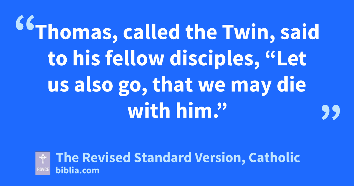 5 Now Jesus loved Martha and her sister and Lazarus. 6 So when he heard that he was ill, he stayed two days longer in the place where he was. 7 Then after this he said to the disciples, “Let us go into Judea again.” 8 The disciples said to him, “Rabbi, the Jews were but now seeking to stone you, and are you going there again?” 9 Jesus answered, “Are there not twelve hours in the day? If any one walks in the day, he does not stumble, because he sees the light of this world. 10 But if any one walks in the night, he stumbles, because the light is not in him.” 11 Thus he spoke, and then he said to them, “Our friend Lazarus has fallen asleep, but I go to awake him out of sleep.” 12 The disciples said to him, “Lord, if he has fallen asleep, he will recover.” 13 Now Jesus had spoken of his death, but they thought that he meant taking rest in sleep. 14 Then Jesus told them plainly, “Lazarus is dead; 15 and for your sake I am glad that I was not there, so that you may believe. But let us go to him.” 16 Thomas, called the Twin, said to his fellow disciples, “Let us also go, that we may die with him.”