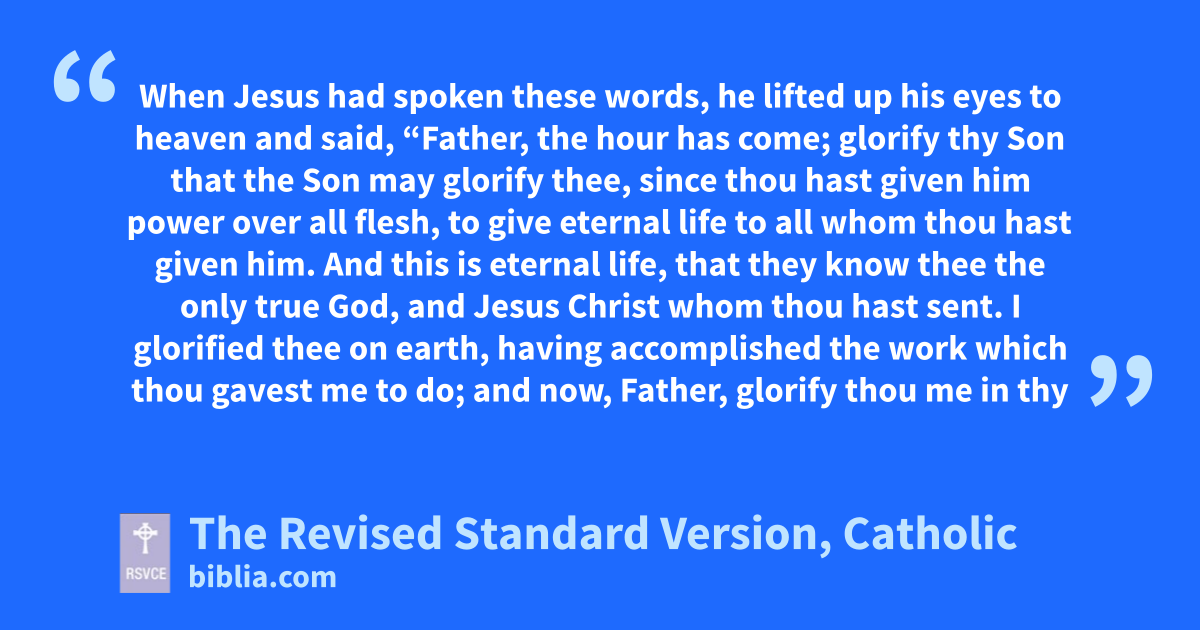 1 When Jesus had spoken these words, he lifted up his eyes to heaven and said, “Father, the hour has come; glorify thy Son that the Son may glorify thee, 2 since thou hast given him power over all flesh, to give eternal life to all whom thou hast given him. 3 And this is eternal life, that they know thee the only true God, and Jesus Christ whom thou hast sent. 4 I glorified thee on earth, having accomplished the work which thou gavest me to do; 5 and now, Father, glorify thou me in thy own presence with the glory which I had with thee before the world was made.
