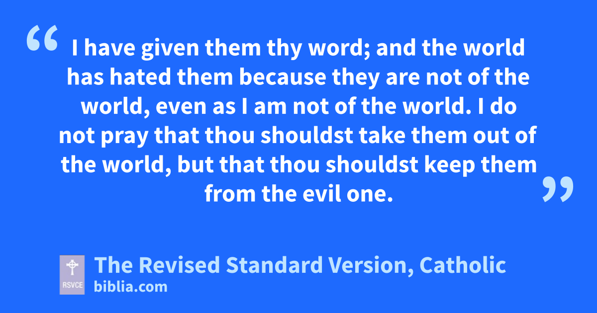 6 “I have manifested thy name to the men whom thou gavest me out of the world; thine they were, and thou gavest them to me, and they have kept thy word. 7 Now they know that everything that thou hast given me is from thee; 8 for I have given them the words which thou gavest me, and they have received them and know in truth that I came from thee; and they have believed that thou didst send me. 9 I am praying for them; I am not praying for the world but for those whom thou hast given me, for they are thine; 10 all mine are thine, and thine are mine, and I am glorified in them. 11 And now I am no more in the world, but they are in the world, and I am coming to thee. Holy Father, keep them in thy name, which thou hast given me, that they may be one, even as we are one. 12 While I was with them, I kept them in thy name, which thou hast given me; I have guarded them, and none of them is lost but the son of perdition, that the scripture might be fulfilled. 13 But now I am coming to thee; and these things I speak in the world, that they may have my joy fulfilled in themselves. 14 I have given them thy word; and the world has hated them because they are not of the world, even as I am not of the world. 15 I do not pray that thou shouldst take them out of the world, but that thou shouldst keep them from the evil one.* 16 They are not of the world, even as I am not of the world. 17 Sanctify them in the truth; thy word is truth. 18 As thou didst send me into the world, so I have sent them into the world. 19 And for their sake I consecrate myself, that they also may be consecrated in truth.