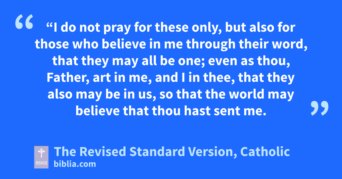 20 “I do not pray for these only, but also for those who believe in me through their word, 21 that they may all be one; even as thou, Father, art in me, and I in thee, that they also may be in us, so that the world may believe that thou hast sent me. 22 The glory which thou hast given me I have given to them, that they may be one even as we are one, 23 I in them and thou in me, that they may become perfectly one, so that the world may know that thou hast sent me and hast loved them even as thou hast loved me. 24 Father, I desire that they also, whom thou hast given me, may be with me where I am, to behold my glory which thou hast given me in thy love for me before the foundation of the world. 25 O righteous Father, the world has not known thee, but I have known thee; and these know that thou hast sent me. 26 I made known to them thy name, and I will make it known, that the love with which thou hast loved me may be in them, and I in them.”