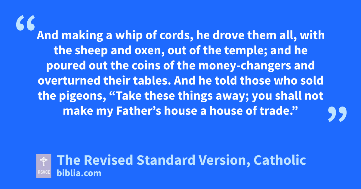 13 The Passover of the Jews was at hand, and Jesus went up to Jerusalem. 14 In the temple he found those who were selling oxen and sheep and pigeons, and the money-changers at their business. 15 And making a whip of cords, he drove them all, with the sheep and oxen, out of the temple; and he poured out the coins of the money-changers and overturned their tables. 16 And he told those who sold the pigeons, “Take these things away; you shall not make my Father’s house a house of trade.” 17 His disciples remembered that it was written, “Zeal for thy house will consume me.” 18 The Jews then said to him, “What sign have you to show us for doing this?” 19 Jesus answered them, “Destroy this temple, and in three days I will raise it up.” 20 The Jews then said, “It has taken forty-six years to build this temple, and will you raise it up in three days?” 21 But he spoke of the temple of his body. 22 When therefore he was raised from the dead, his disciples remembered that he had said this; and they believed the scripture and the word which Jesus had spoken.