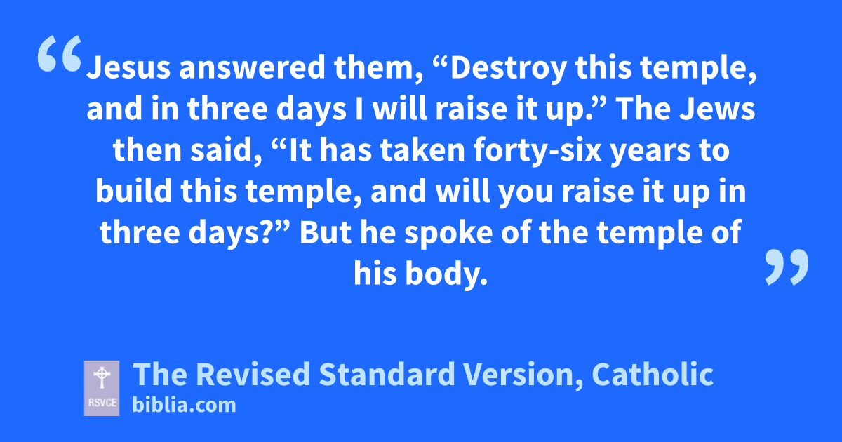 13 The Passover of the Jews was at hand, and Jesus went up to Jerusalem. 14 In the temple he found those who were selling oxen and sheep and pigeons, and the money-changers at their business. 15 And making a whip of cords, he drove them all, with the sheep and oxen, out of the temple; and he poured out the coins of the money-changers and overturned their tables. 16 And he told those who sold the pigeons, “Take these things away; you shall not make my Father’s house a house of trade.” 17 His disciples remembered that it was written, “Zeal for thy house will consume me.” 18 The Jews then said to him, “What sign have you to show us for doing this?” 19 Jesus answered them, “Destroy this temple, and in three days I will raise it up.” 20 The Jews then said, “It has taken forty-six years to build this temple, and will you raise it up in three days?” 21 But he spoke of the temple of his body. 22 When therefore he was raised from the dead, his disciples remembered that he had said this; and they believed the scripture and the word which Jesus had spoken.