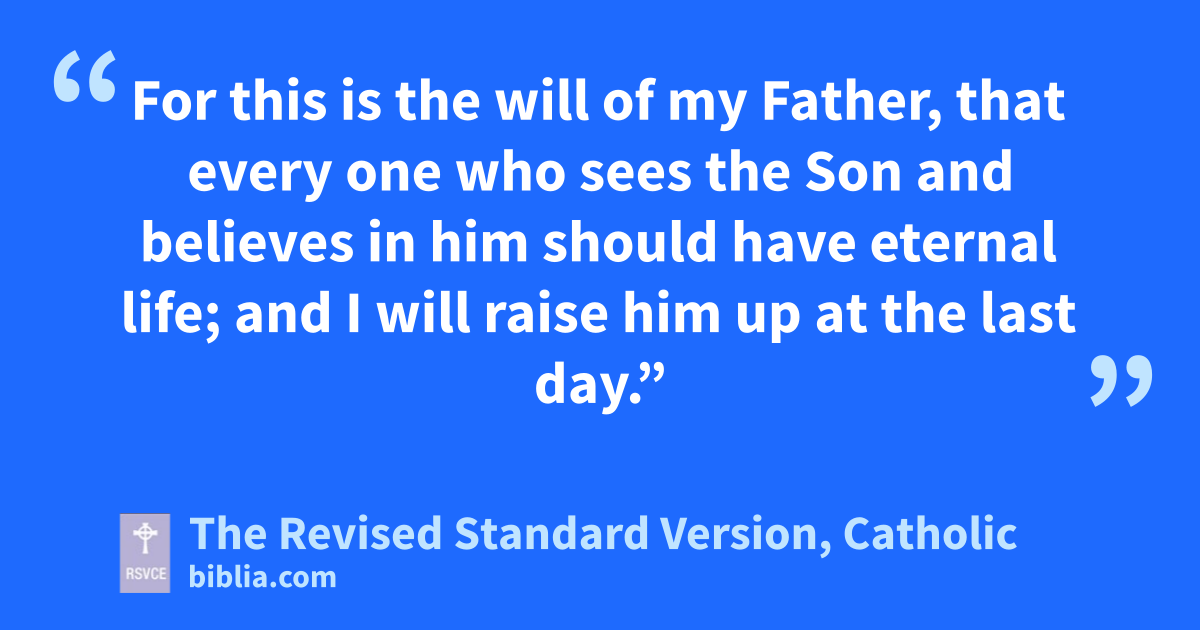 35 Jesus said to them, “I am the bread of life; he who comes to me shall not hunger, and he who believes in me shall never thirst. 36 But I said to you that you have seen me and yet do not believe. 37 All that the Father gives me will come to me; and him who comes to me I will not cast out. 38 For I have come down from heaven, not to do my own will, but the will of him who sent me; 39 and this is the will of him who sent me, that I should lose nothing of all that he has given me, but raise it up at the last day. 40 For this is the will of my Father, that every one who sees the Son and believes in him should have eternal life; and I will raise him up at the last day.”
