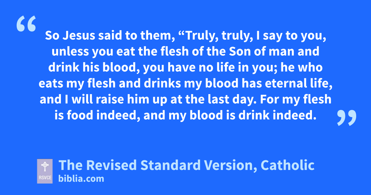 52 The Jews then disputed among themselves, saying, “How can this man give us his flesh to eat?” 53 So Jesus said to them, “Truly, truly, I say to you, unless you eat the flesh of the Son of man and drink his blood, you have no life in you; 54 he who eats my flesh and drinks my blood has eternal life, and I will raise him up at the last day. 55 For my flesh is food indeed, and my blood is drink indeed. 56 He who eats my flesh and drinks my blood abides in me, and I in him. 57 As the living Father sent me, and I live because of the Father, so he who eats me will live because of me. 58 This is the bread which came down from heaven, not such as the fathers ate and died; he who eats this bread will live for ever.” 59 This he said in the synagogue, as he taught at Capernaum.
