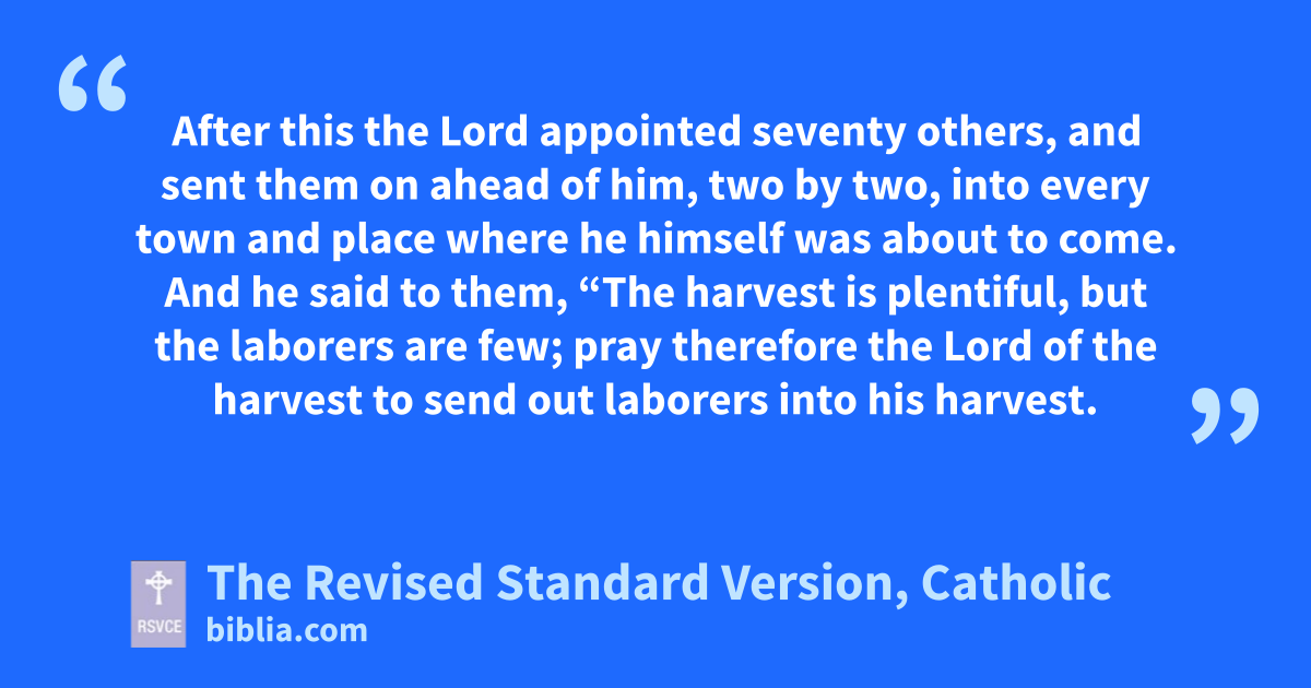 1 After this the Lord appointed seventy* others, and sent them on ahead of him, two by two, into every town and place where he himself was about to come. 2 And he said to them, “The harvest is plentiful, but the laborers are few; pray therefore the Lord of the harvest to send out laborers into his harvest. 3 Go your way; behold, I send you out as lambs in the midst of wolves. 4 Carry no purse, no bag, no sandals; and salute no one on the road. 5 Whatever house you enter, first say, ‘Peace be to this house!’ 6 And if a son of peace is there, your peace shall rest upon him; but if not, it shall return to you. 7 And remain in the same house, eating and drinking what they provide, for the laborer deserves his wages; do not go from house to house. 8 Whenever you enter a town and they receive you, eat what is set before you; 9 heal the sick in it and say to them, ‘The kingdom of God has come near to you.’ 10 But whenever you enter a town and they do not receive you, go into its streets and say, 11 ‘Even the dust of your town that clings to our feet, we wipe off against you; nevertheless know this, that the kingdom of God has come near.’ 12 I tell you, it shall be more tolerable on that day for Sodom than for that town.