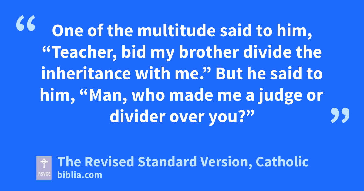 13 One of the multitude said to him, “Teacher, bid my brother divide the inheritance with me.” 14 But he said to him, “Man, who made me a judge or divider over you?” 15 And he said to them, “Take heed, and beware of all covetousness; for a man’s life does not consist in the abundance of his possessions.” 16 And he told them a parable, saying, “The land of a rich man brought forth plentifully; 17 and he thought to himself, ‘What shall I do, for I have nowhere to store my crops?’ 18 And he said, ‘I will do this: I will pull down my barns, and build larger ones; and there I will store all my grain and my goods. 19 And I will say to my soul, Soul, you have ample goods laid up for many years; take your ease, eat, drink, be merry.’ 20 But God said to him, ‘Fool! This night your soul is required of you; and the things you have prepared, whose will they be?’ 21 So is he who lays up treasure for himself, and is not rich toward God.”