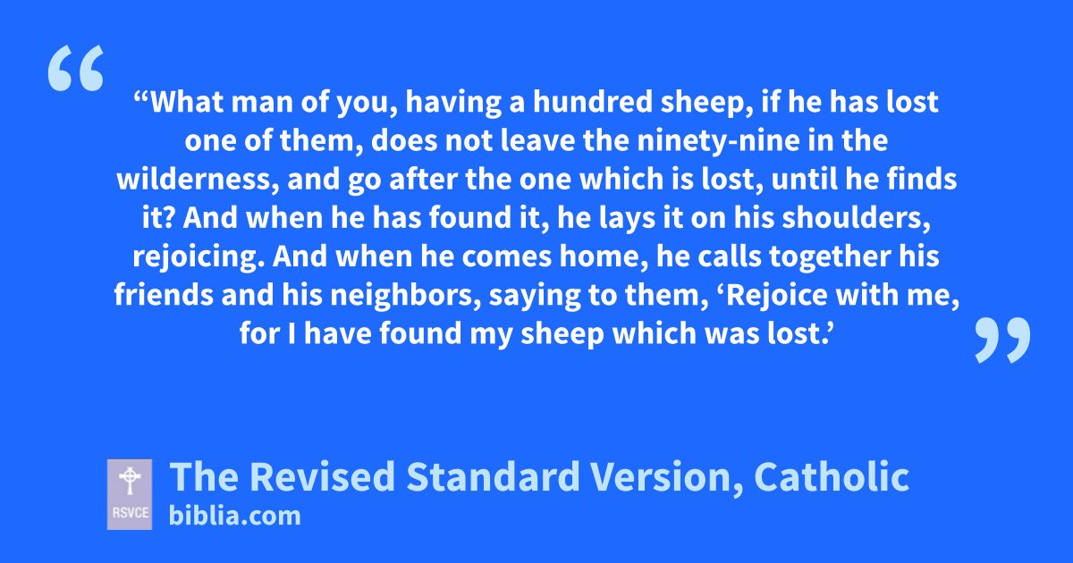 3 So he told them this parable: 4 “What man of you, having a hundred sheep, if he has lost one of them, does not leave the ninety-nine in the wilderness, and go after the one which is lost, until he finds it? 5 And when he has found it, he lays it on his shoulders, rejoicing. 6 And when he comes home, he calls together his friends and his neighbors, saying to them, ‘Rejoice with me, for I have found my sheep which was lost.’ 7 Just so, I tell you, there will be more joy in heaven over one sinner who repents than over ninety-nine righteous persons who need no repentance.