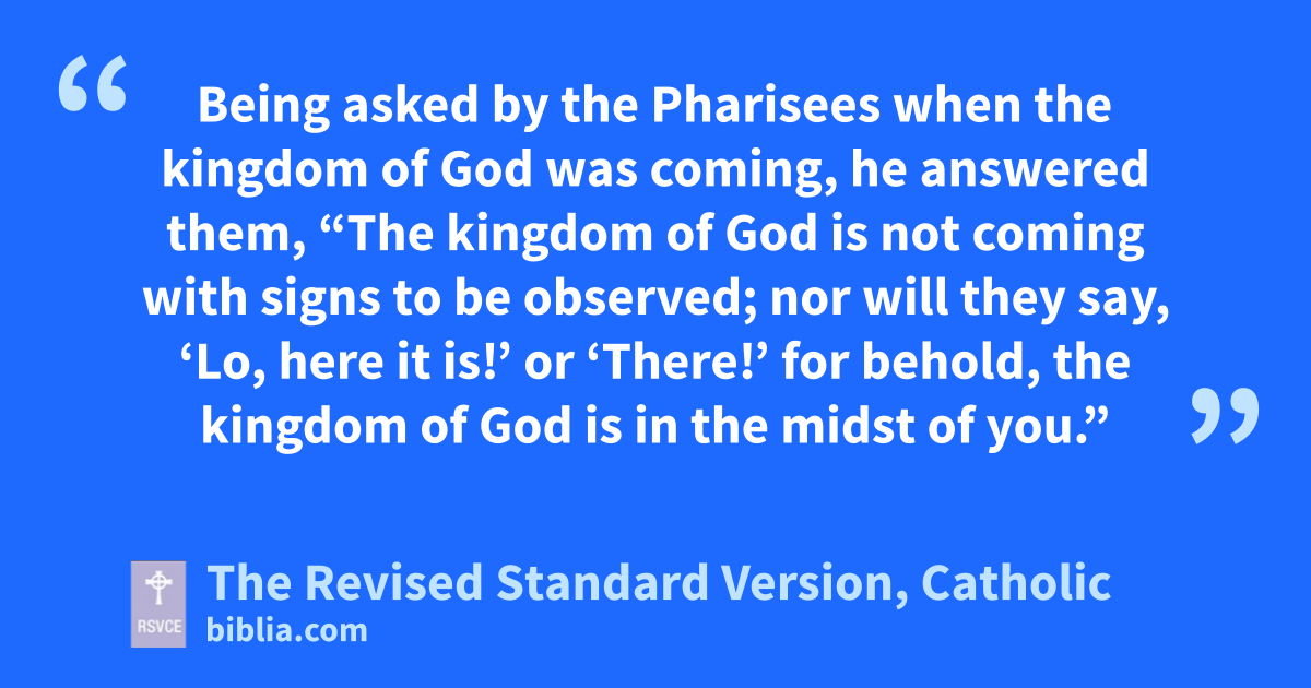20 Being asked by the Pharisees when the kingdom of God was coming, he answered them, “The kingdom of God is not coming with signs to be observed; 21 nor will they say, ‘Lo, here it is!’ or ‘There!’ for behold, the kingdom of God is in the midst of you.”z