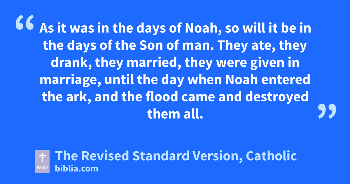 22 And he said to the disciples, “The days are coming when you will desire to see one of the days of the Son of man, and you will not see it. 23 And they will say to you, ‘Lo, there!’ or ‘Lo, here!’ Do not go, do not follow them. 24 For as the lightning flashes and lights up the sky from one side to the other, so will the Son of man be in his day.* 25 But first he must suffer many things and be rejected by this generation. 26 As it was in the days of Noah, so will it be in the days of the Son of man. 27 They ate, they drank, they married, they were given in marriage, until the day when Noah entered the ark, and the flood came and destroyed them all. 28 Likewise as it was in the days of Lot—they ate, they drank, they bought, they sold, they planted, they built, 29 but on the day when Lot went out from Sodom fire and sulphur rained from heaven and destroyed them all— 30 so will it be on the day when the Son of man is revealed. 31 On that day, let him who is on the housetop, with his goods in the house, not come down to take them away; and likewise let him who is in the field not turn back. 32 Remember Lot’s wife. 33 Whoever seeks to gain his life will lose it, but whoever loses his life will preserve it. 34 I tell you, in that night there will be two in one bed; one will be taken and the other left. 35 There will be two women grinding together; one will be taken and the other left.”* 37 And they said to him, “Where, Lord?” He said to them, “Where the body is, there the eagles* will be gathered together.”