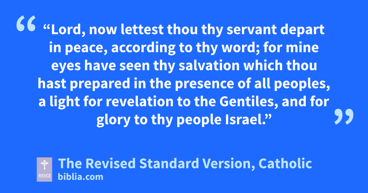 22 And when the time came for their purification according to the law of Moses, they brought him up to Jerusalem to present him to the Lord 23 (as it is written in the law of the Lord, “Every male that opens the womb shall be called holy to the Lord”) 24 and to offer a sacrifice according to what is said in the law of the Lord, “a pair of turtledoves, or two young pigeons.” 25 Now there was a man in Jerusalem, whose name was Simeon, and this man was righteous and devout, looking for the consolation of Israel, and the Holy Spirit was upon him. 26 And it had been revealed to him by the Holy Spirit that he should not see death before he had seen the Lord’s Christ. 27 And inspired by the Spirit* he came into the temple; and when the parents brought in the child Jesus, to do for him according to the custom of the law, 28 he took him up in his arms and blessed God and said,