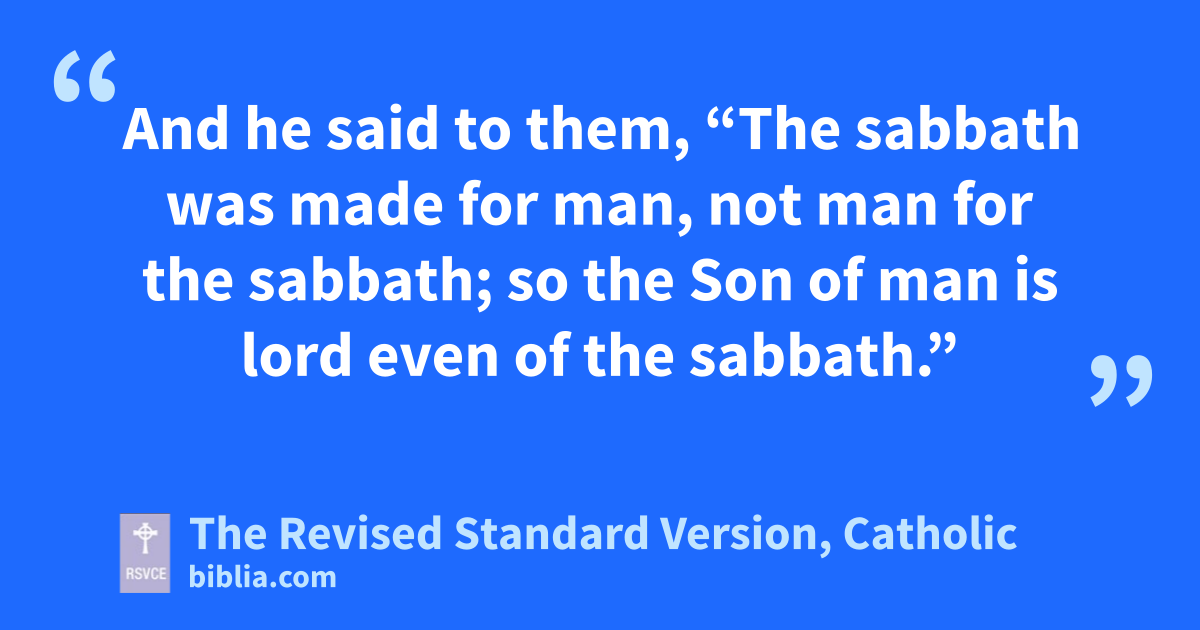 23 One sabbath he was going through the grainfields; and as they made their way his disciples began to pluck heads of grain. 24 And the Pharisees said to him, “Look, why are they doing what is not lawful on the sabbath?” 25 And he said to them, “Have you never read what David did, when he was in need and was hungry, he and those who were with him: 26 how he entered the house of God, when Abiathar was high priest, and ate the bread of the Presence, which it is not lawful for any but the priests to eat, and also gave it to those who were with him?” 27 And he said to them, “The sabbath was made for man, not man for the sabbath; 28 so the Son of man is lord even of the sabbath.”