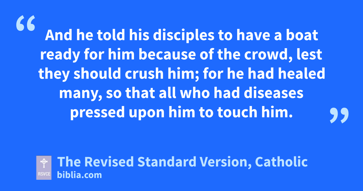 7 Jesus withdrew with his disciples to the sea, and a great multitude from Galilee followed; also from Judea 8 and Jerusalem and Idumea and from beyond the Jordan and from about Tyre and Sidon a great multitude, hearing all that he did, came to him. 9 And he told his disciples to have a boat ready for him because of the crowd, lest they should crush him; 10 for he had healed many, so that all who had diseases pressed upon him to touch him. 11 And whenever the unclean spirits beheld him, they fell down before him and cried out, “You are the Son of God.” 12 And he strictly ordered them not to make him known.