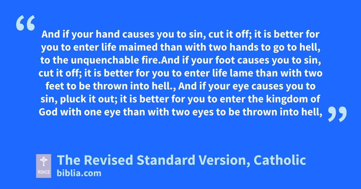 42 “Whoever causes one of these little ones who believe in me to sin, it would be better for him if a great millstone were hung round his neck and he were thrown into the sea. 43 And if your hand causes you to sin,l cut it off; it is better for you to enter life maimed than with two hands to go to hell,m to the unquenchable fire.* 45 And if your foot causes you to sin, cut it off; it is better for you to enter life lame than with two feet to be thrown into hell.m,* 47 And if your eye causes you to sin,* pluck it out; it is better for you to enter the kingdom of God with one eye than with two eyes to be thrown into hell,m 48 where their worm does not die, and the fire is not quenched. 49 For every one will be salted with fire.* 50 Salt is good; but if the salt has lost its saltness, how will you season it? Have salt in yourselves, and be at peace with one another.”