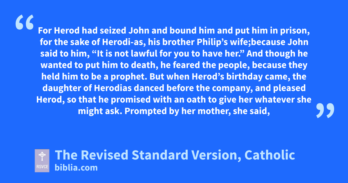 1 At that time Herod the tetrarch heard about the fame of Jesus; 2 and he said to his servants, “This is John the Baptist, he has been raised from the dead; that is why these powers are at work in him.” 3 For Herod had seized John and bound him and put him in prison, for the sake of Herodi-as, his brother Philip’s wife;* 4 because John said to him, “It is not lawful for you to have her.” 5 And though he wanted to put him to death, he feared the people, because they held him to be a prophet. 6 But when Herod’s birthday came, the daughter of Herodias danced before the company, and pleased Herod, 7 so that he promised with an oath to give her whatever she might ask. 8 Prompted by her mother, she said, “Give me the head of John the Baptist here on a platter.” 9 And the king was sorry; but because of his oaths and his guests he commanded it to be given; 10 he sent and had John beheaded in the prison, 11 and his head was brought on a platter and given to the girl, and she brought it to her mother. 12 And his disciples came and took the body and buried it; and they went and told Jesus.