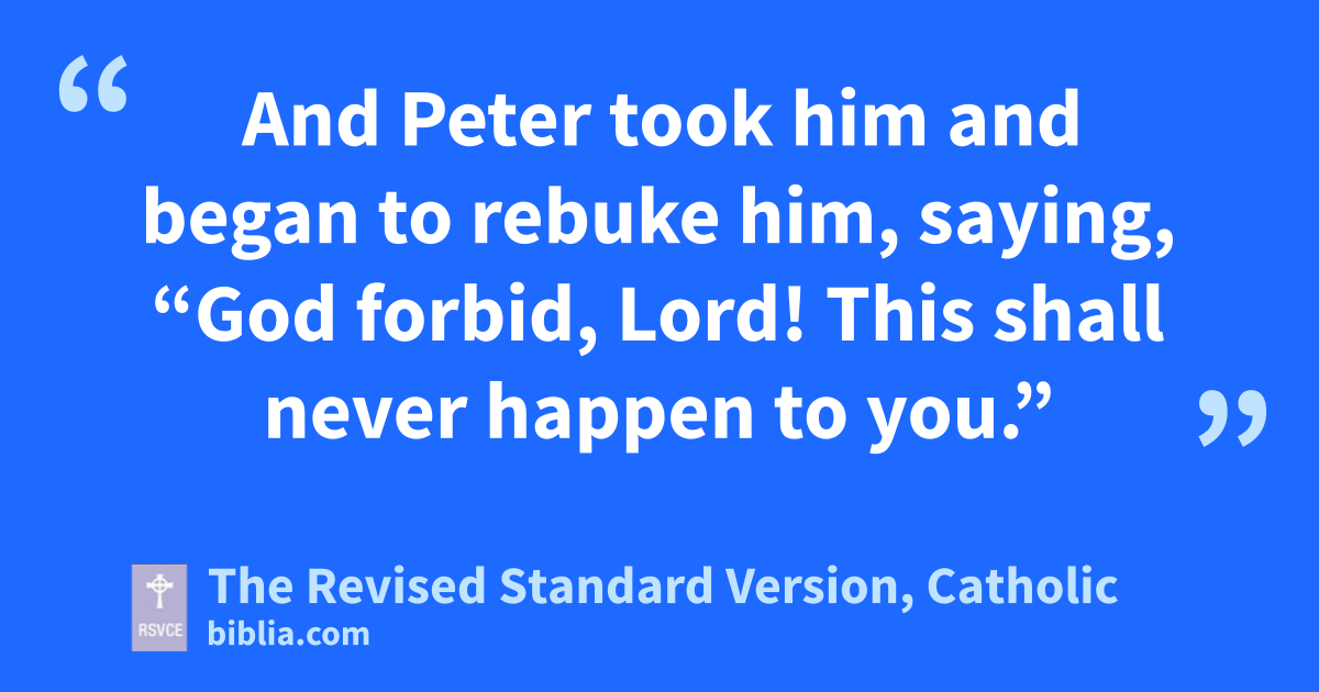 21 From that time Jesus began to show his disciples that he must go to Jerusalem and suffer many things from the elders and chief priests and scribes, and be killed, and on the third day be raised. 22 And Peter took him and began to rebuke him, saying, “God forbid, Lord! This shall never happen to you.” 23 But he turned and said to Peter, “Get behind me, Satan! You are a hindrancev to me; for you are not on the side of God, but of men.”