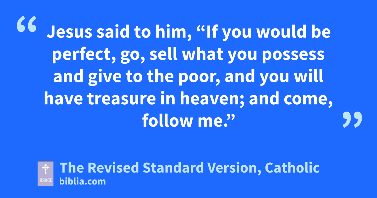 16 And behold, one came up to him, saying, “Teacher, what good deed must I do, to have eternal life?” 17 And he said to him, “Why do you ask me about what is good? One there is who is good. If you would enter life, keep the commandments.” 18 He said to him, “Which?” And Jesus said, “You shall not kill, You shall not commit adultery, You shall not steal, You shall not bear false witness, 19 Honor your father and mother, and, You shall love your neighbor as yourself.” 20 The young man said to him, “All these I have observed; what do I still lack?” 21 Jesus said to him, “If you would be perfect, go, sell what you possess and give to the poor, and you will have treasure in heaven; and come, follow me.” 22 When the young man heard this he went away sorrowful; for he had great possessions.