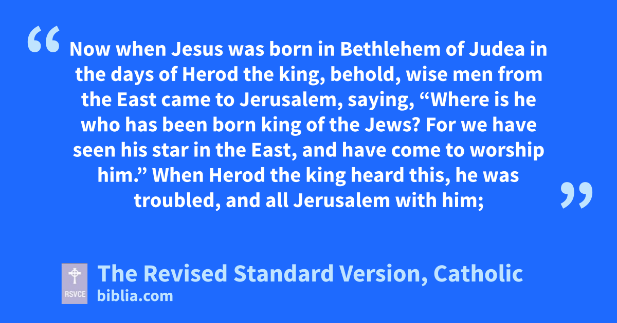 1 Now when Jesus was born in Bethlehem of Judea in the days of Herod the king, behold, wise men from the East came to Jerusalem, saying, 2 “Where is he who has been born king of the Jews? For we have seen his star in the East, and have come to worship him.” 3 When Herod the king heard this, he was troubled, and all Jerusalem with him; 4 and assembling all the chief priests and scribes of the people, he inquired of them where the Christ was to be born. 5 They told him, “In Bethlehem of Judea; for so it is written by the prophet: