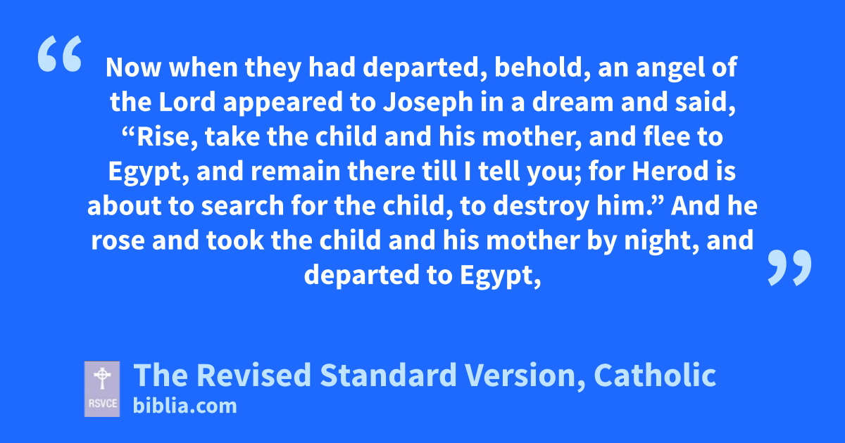 13 Now when they had departed, behold, an angel of the Lord appeared to Joseph in a dream and said, “Rise, take the child and his mother, and flee to Egypt, and remain there till I tell you; for Herod is about to search for the child, to destroy him.” 14 And he rose and took the child and his mother by night, and departed to Egypt, 15 and remained there until the death of Herod. This was to fulfil what the Lord had spoken by the prophet, “Out of Egypt have I called my son.”