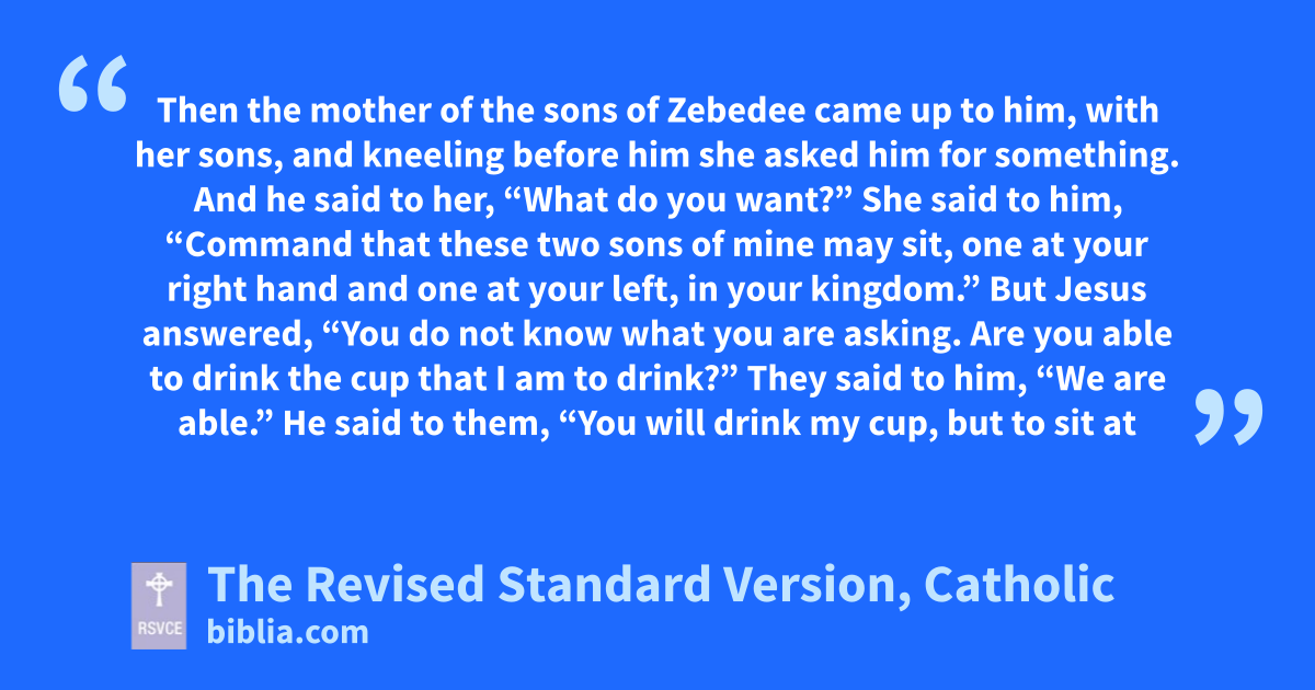 20 Then the mother of the sons of Zebedee came up to him, with her sons, and kneeling before him she asked him for something. 21 And he said to her, “What do you want?” She said to him, “Command that these two sons of mine may sit, one at your right hand and one at your left, in your kingdom.” 22 But Jesus answered, “You do not know what you are asking. Are you able to drink the cup that I am to drink?” They said to him, “We are able.” 23 He said to them, “You will drink my cup, but to sit at my right hand and at my left is not mine to grant, but it is for those for whom it has been prepared by my Father.” 24 And when the ten heard it, they were indignant at the two brothers. 25 But Jesus called them to him and said, “You know that the rulers of the Gentiles lord it over them, and their great men exercise authority over them. 26 It shall not be so among you; but whoever would be great among you must be your servant, 27 and whoever would be first among you must be your slave; 28 even as the Son of man came not to be served but to serve, and to give his life as a ransom for many.”