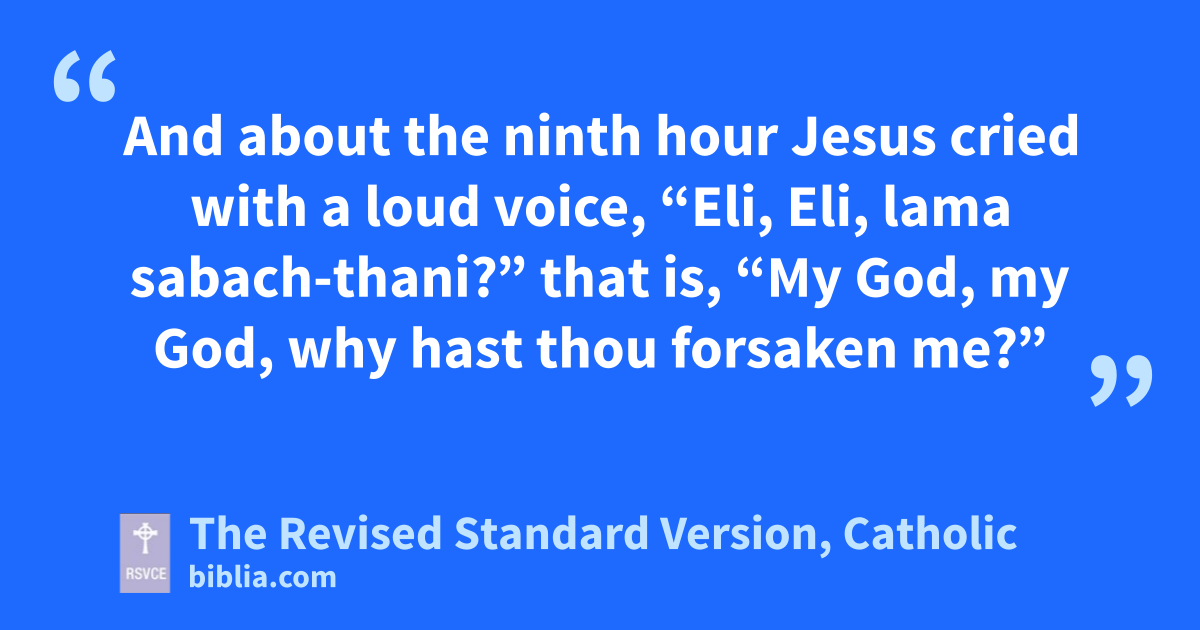 45 Now from the sixth hour there was darkness over all the landm until the ninth hour. 46 And about the ninth hour Jesus cried with a loud voice, “Eli, Eli, lama sabach-thani?” that is, “My God, my God, why hast thou forsaken me?” 47 And some of the bystanders hearing it said, “This man is calling Elijah.” 48 And one of them at once ran and took a sponge, filled it with vinegar, and put it on a reed, and gave it to him to drink. 49 But the others said, “Wait, let us see whether Elijah will come to save him.”n 50 And Jesus cried again with a loud voice and yielded up his spirit.