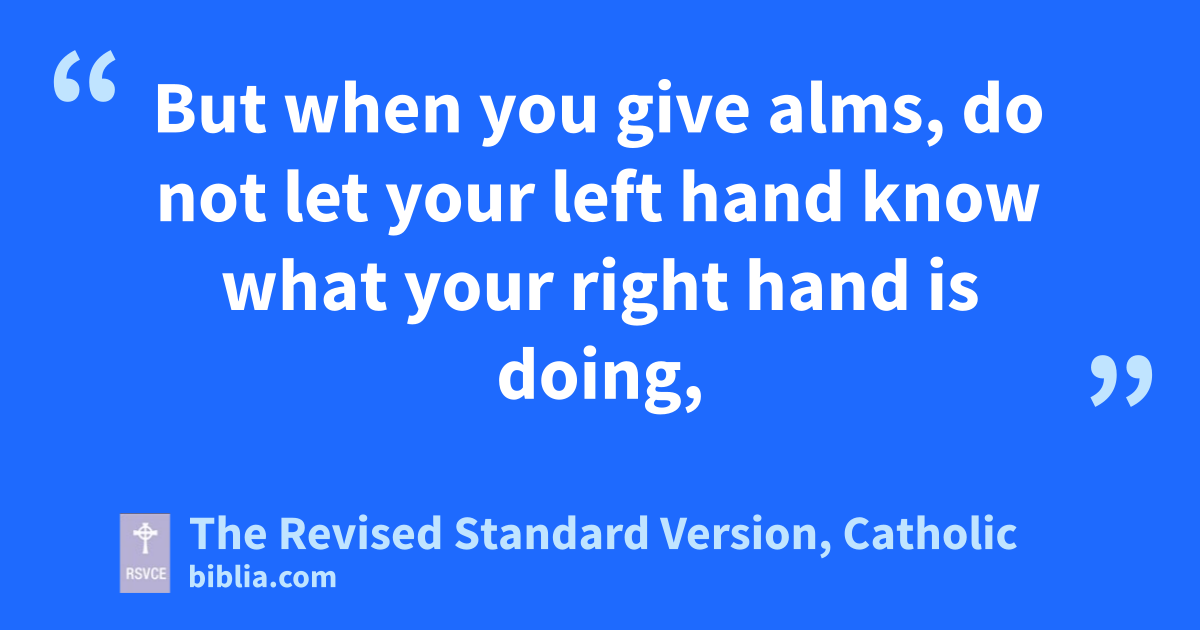 2 “Thus, when you give alms, sound no trumpet before you, as the hypocrites do in the synagogues and in the streets, that they may be praised by men. Truly, I say to you, they have received their reward. 3 But when you give alms, do not let your left hand know what your right hand is doing, 4 so that your alms may be in secret; and your Father who sees in secret will reward you.