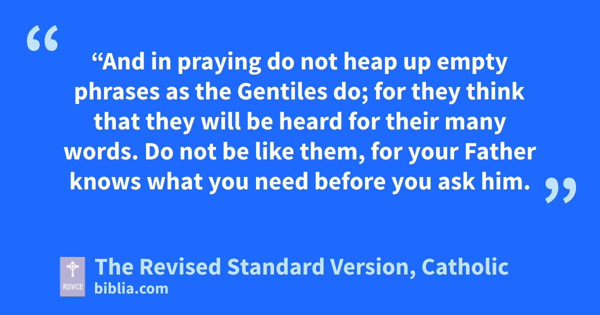 7 “And in praying do not heap up empty phrases as the Gentiles do; for they think that they will be heard for their many words. 8 Do not be like them, for your Father knows what you need before you ask him. 9 Pray then like this: