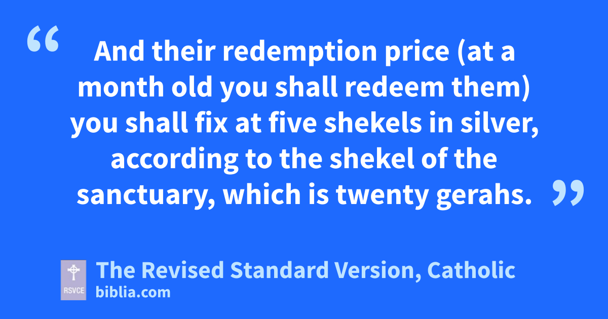 8 Then the Lord said to Aaron, “And behold, I have given you whatever is kept of the offerings made to me, all the consecrated things of the people of Israel; I have given them to you as a portion, and to your sons as a perpetual due. 9 This shall be yours of the most holy things, reserved from the fire; every offering of theirs, every cereal offering of theirs and every sin offering of theirs and every guilt offering of theirs, which they render to me, shall be most holy to you and to your sons. 10 In a most holy place shall you eat of it; every male may eat of it; it is holy to you. 11 This also is yours, the offering of their gift, all the wave offerings of the people of Israel; I have given them to you, and to your sons and daughters with you, as a perpetual due; every one who is clean in your house may eat of it. 12 All the best of the oil, and all the best of the wine and of the grain, the first fruits of what they give to the Lord, I give to you. 13 The first ripe fruits of all that is in their land, which they bring to the Lord, shall be yours; every one who is clean in your house may eat of it. 14 Every devoted thing in Israel shall be yours. 15 Everything that opens the womb of all flesh, whether man or beast, which they offer to the Lord, shall be yours; nevertheless the first-born of man you shall redeem, and the firstling of unclean beasts you shall redeem. 16 And their redemption price (at a month old you shall redeem them) you shall fix at five shekels in silver, according to the shekel of the sanctuary, which is twenty gerahs. 17 But the firstling of a cow, or the firstling of a sheep, or the firstling of a goat, you shall not redeem; they are holy. You shall sprinkle their blood upon the altar, and shall burn their fat as an offering by fire, a pleasing odor to the Lord; 18 but their flesh shall be yours, as the breast that is waved and as the right thigh are yours. 19 All the holy offerings which the people of Israel present to the Lord I give to you, and to your sons and daughters with you, as a perpetual due; it is a covenant of salt for ever before the Lord for you and for your offspring with you.” 20 And the Lord said to Aaron, “You shall have no inheritance in their land, neither shall you have any portion among them; I am your portion and your inheritance among the people of Israel.