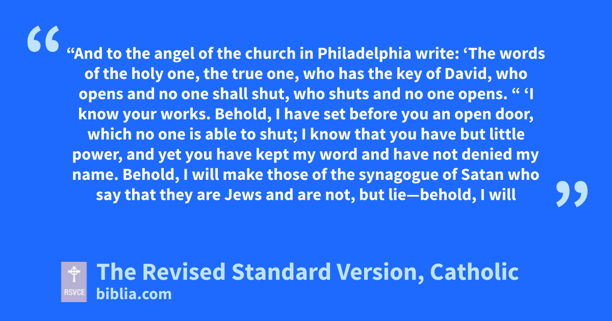 7 “And to the angel of the church in Philadelphia write: ‘The words of the holy one, the true one, who has the key of David, who opens and no one shall shut, who shuts and no one opens.